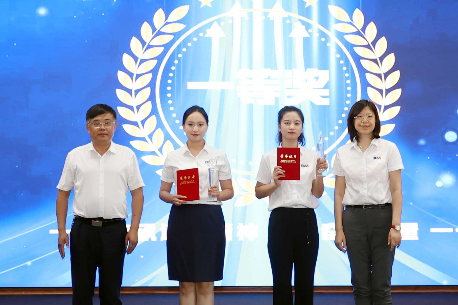 经过激烈角逐,PP拉丝薄膜部的陈子懿和PE低压部的康甜甜斩获一等奖。此外,比赛评出二等奖4名,三等奖6名,参加活动的领导为获奖者颁奖并合影留念。