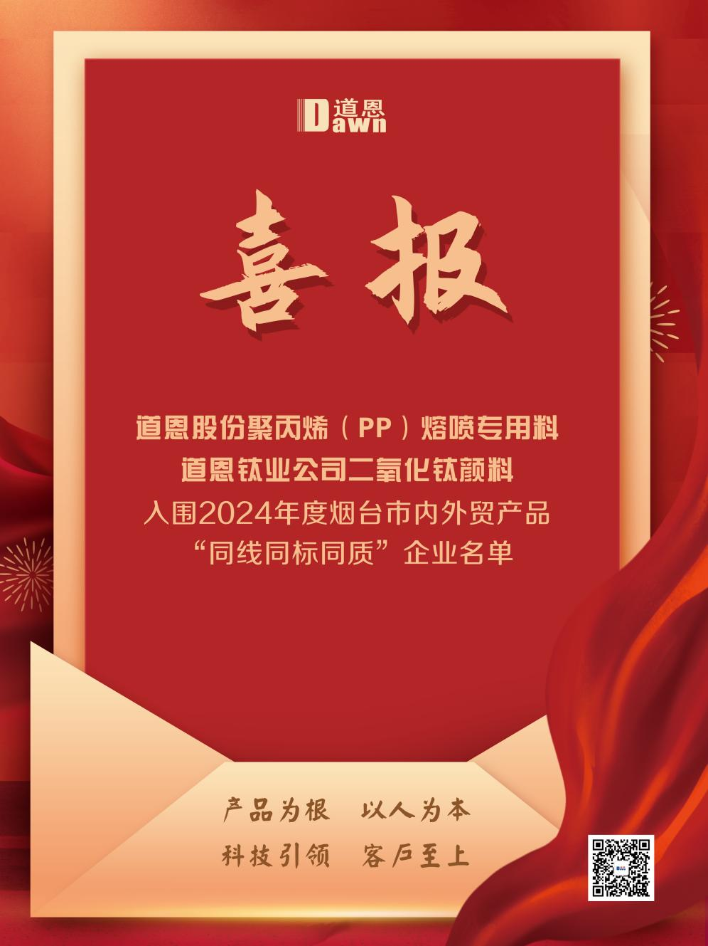 8月30日,烟台市市场监督管理局、烟台市商务局发布2024年度烟台市内外贸产品“同线同标同质”企业名单,678体育股份的聚丙烯(PP)熔喷专用料、678体育钛业公司的二氧化钛颜料名列其中,是龙口市唯一入选该名单的企业。