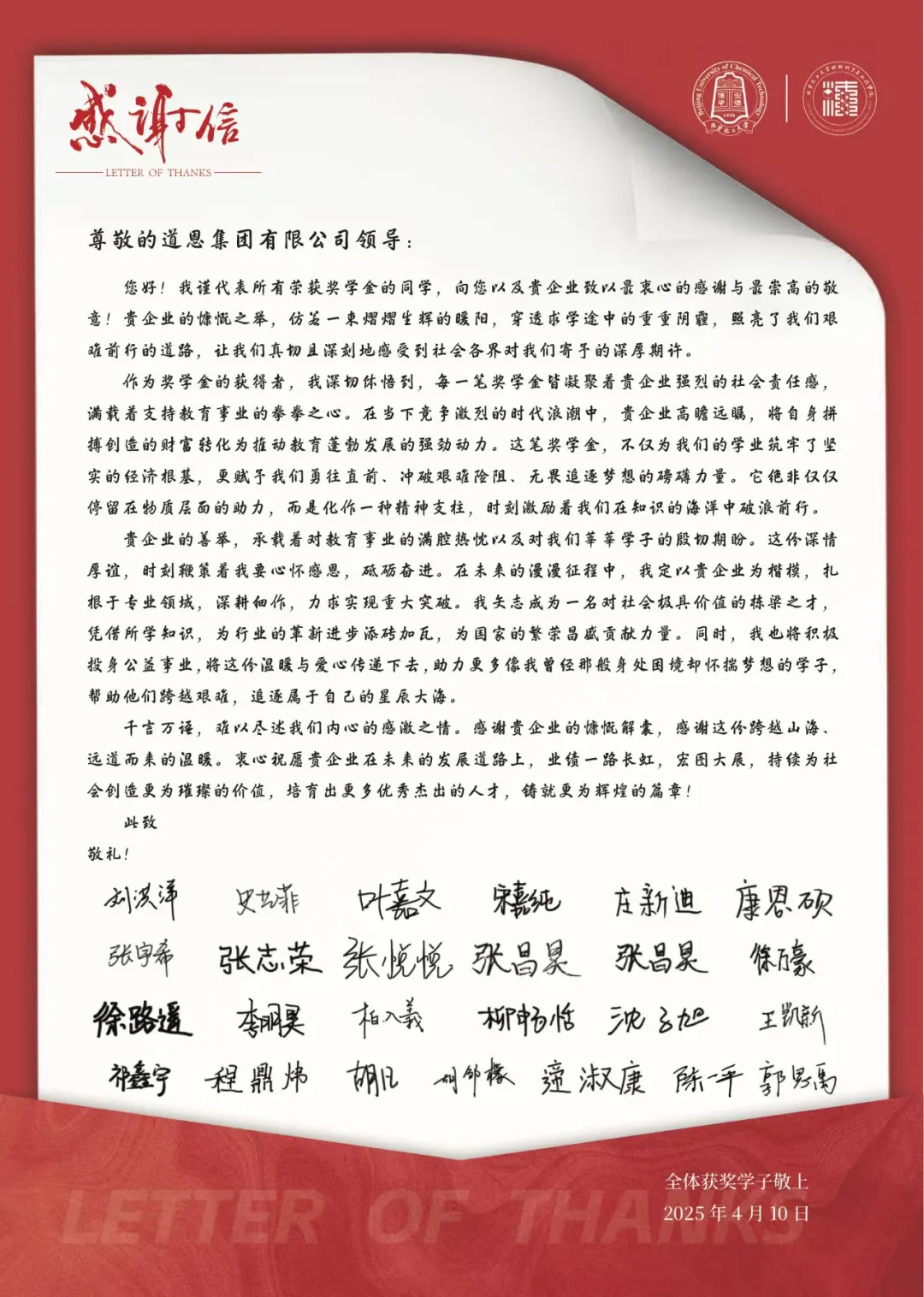 今年4月,北京化工大学获得“678体育高分子专项奖学金”的学子们,联名给678体育集团发来感谢信。他们在信中说,“贵企业的善举,承载着对教育事业的满腔热忱以及对678体育莘莘学子的殷切期盼。这份深情厚谊,时刻鞭策着我要心怀感恩,砥砺奋进。在未来的漫漫征程中,我定以贵企业为楷模,扎根于专业领域,深耕细作,力求实现重大突破。