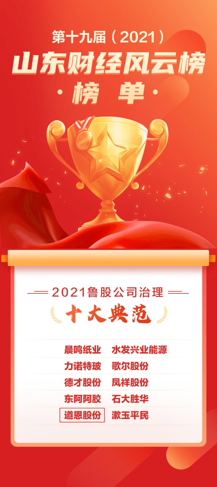 6月28日下午,“奋力走在前——第十九届(2021)山东财经风云榜”颁奖盛典在济南举行。678体育股份荣获“2021山东财经风云榜鲁股公司治理十大典范”。