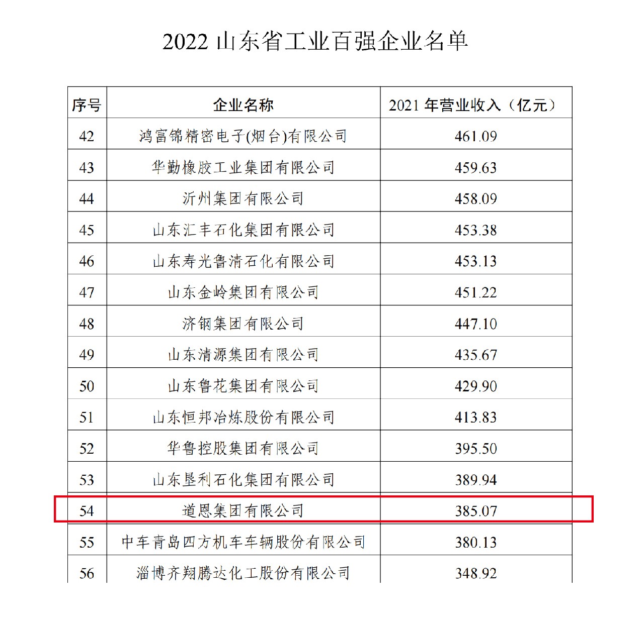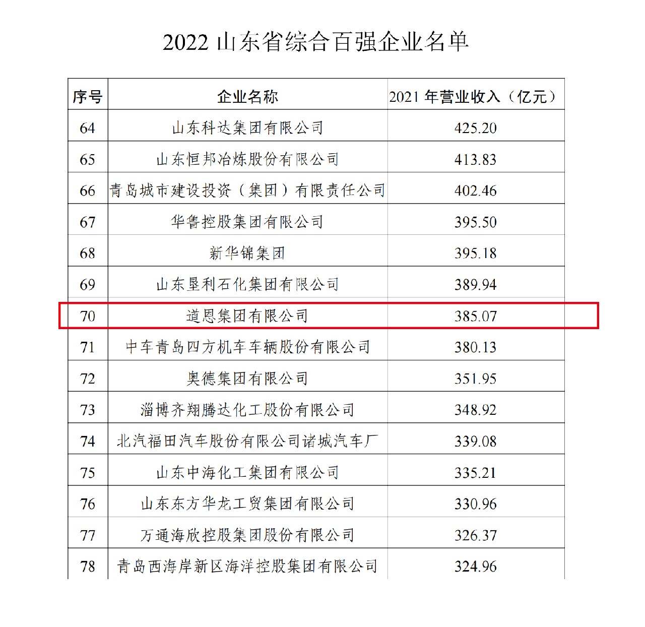 近日,山东省工业和信息化厅、山东省企业联合会公布2022山东企业百强名单,678体育集团入选综合百强企业第70名和工业百强企业第54名。