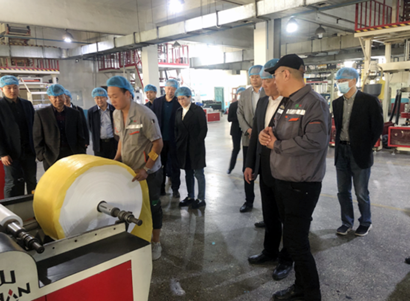 9时10分,高尚伦主席来到青岛周氏公司。在该公司总经理周锐的陪同下,先后参观了吹膜车间、印刷车间和制袋车间,听取了有关企业发展、产品研发、市场应用、未来前景等情况的汇报。